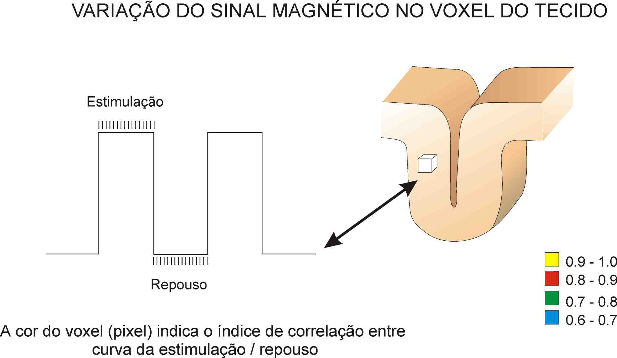 O aparecimento recente do mapeamento funcional por ressonância magnética através da manipulação do contraste intrínseco representado pelas propriedades magnéticas da hemoglobina (Fig.2) permite a detecção de alterações hemodinâmicas locais relacionadas a eventos neurais. A atividade neural acarreta elevação do fluxo sanguineo local por mecanismos que envolvem a liberação de oxido nítrico, um gás vasodilatador difusível (Fig.3). Como o aumento do aporte de sangue arterial nessa região supera em muito a discreta elevação da extração de oxigênio,pelo tendo que está mais ativada, no balanço final, há um aumento da concentração local de oxihemoglobina, que é diamagnética, em detrimento da redução da concentração de desoxi-hemoglobina. A desoxi-hemoglobina tem propriedade paramagnética, por possuir dois elétrons não pareados, o que gera grande susceptibilidade magnética local, levando a perda de sinal na IMR. O efeito final na imagem consiste em aumento da intensidade do sinal nas áreas ativas, quando as imagens de ativação são subtraídas das de repouso. A magnitude dessa diferença de sinal é pequena, na faixa de 1-5%, e só pode ser determinada após cálculo estatístico da correlação da variação da intensidade do sinal nas fases de controle e estimulação. Essa técnica, BOLD (por ressonância magnética funcional) é a base da maioria das investigações em neurociência. feitas com RMF.