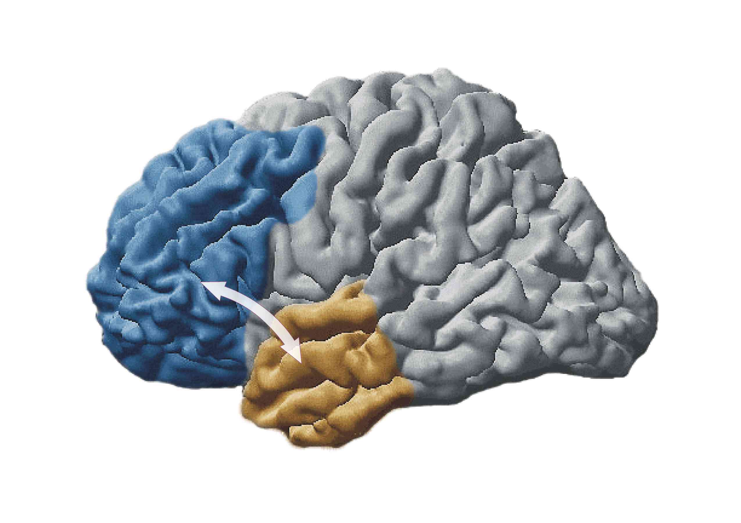 Na porção ventral do córtex frontal observam-se as áreas órbito frontal lateral (OFl) envolvida na inibição de um comportamento em curso e a área órbito frontal medial (OFm) envolvida na relação de memória e emoção relacionadas com recompensa.